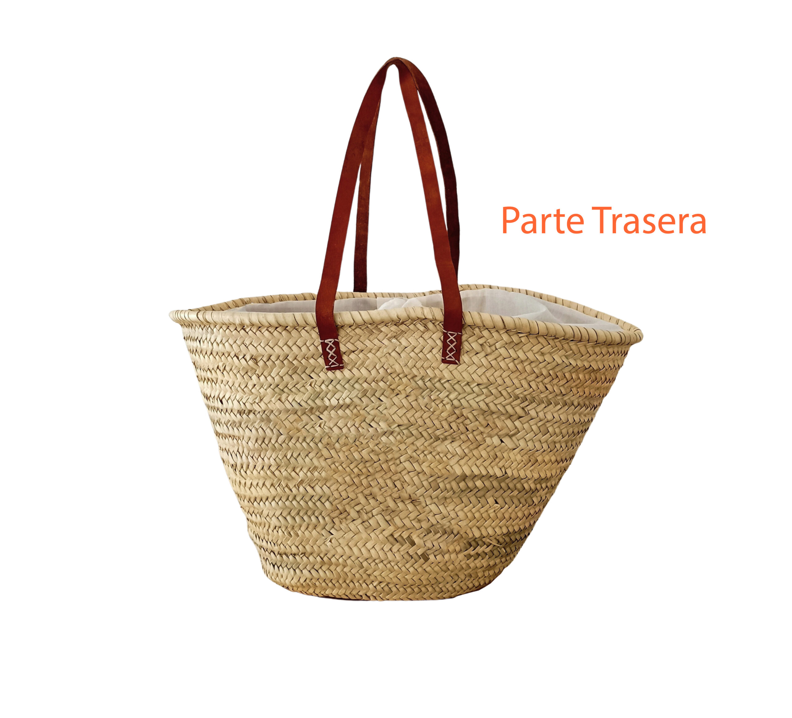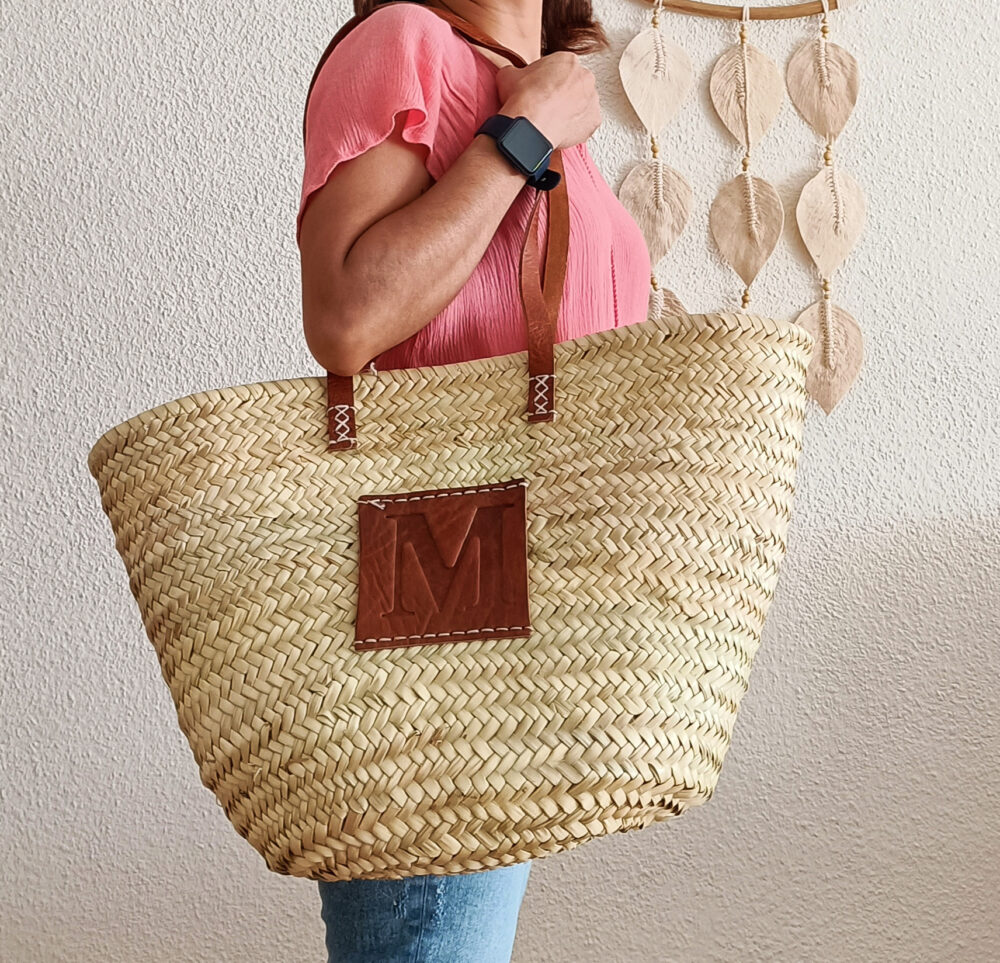 • Capazo de palma natural con forro interior de tela y asa de piel, su exterior es decorado con la letra de tu preferencia en piel.