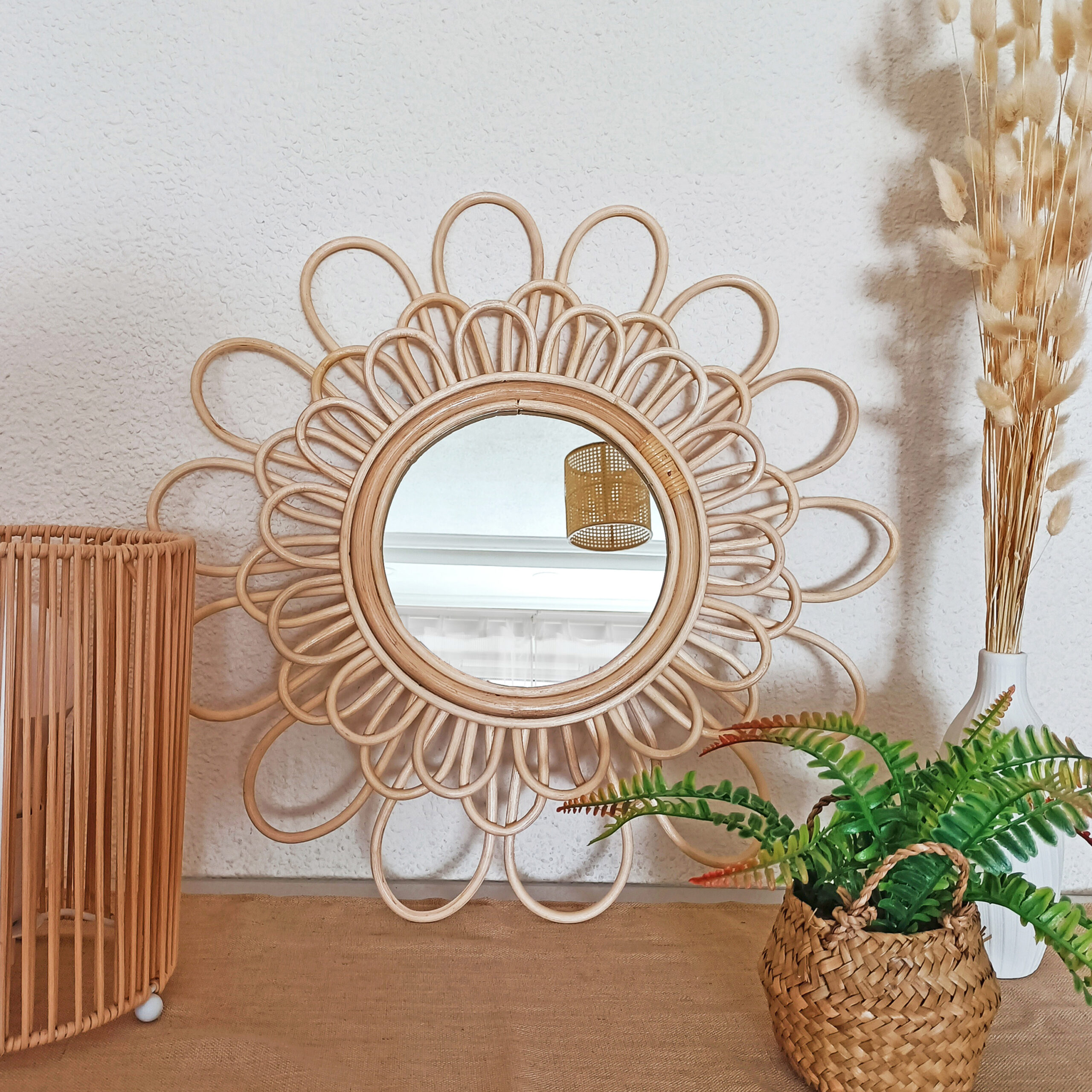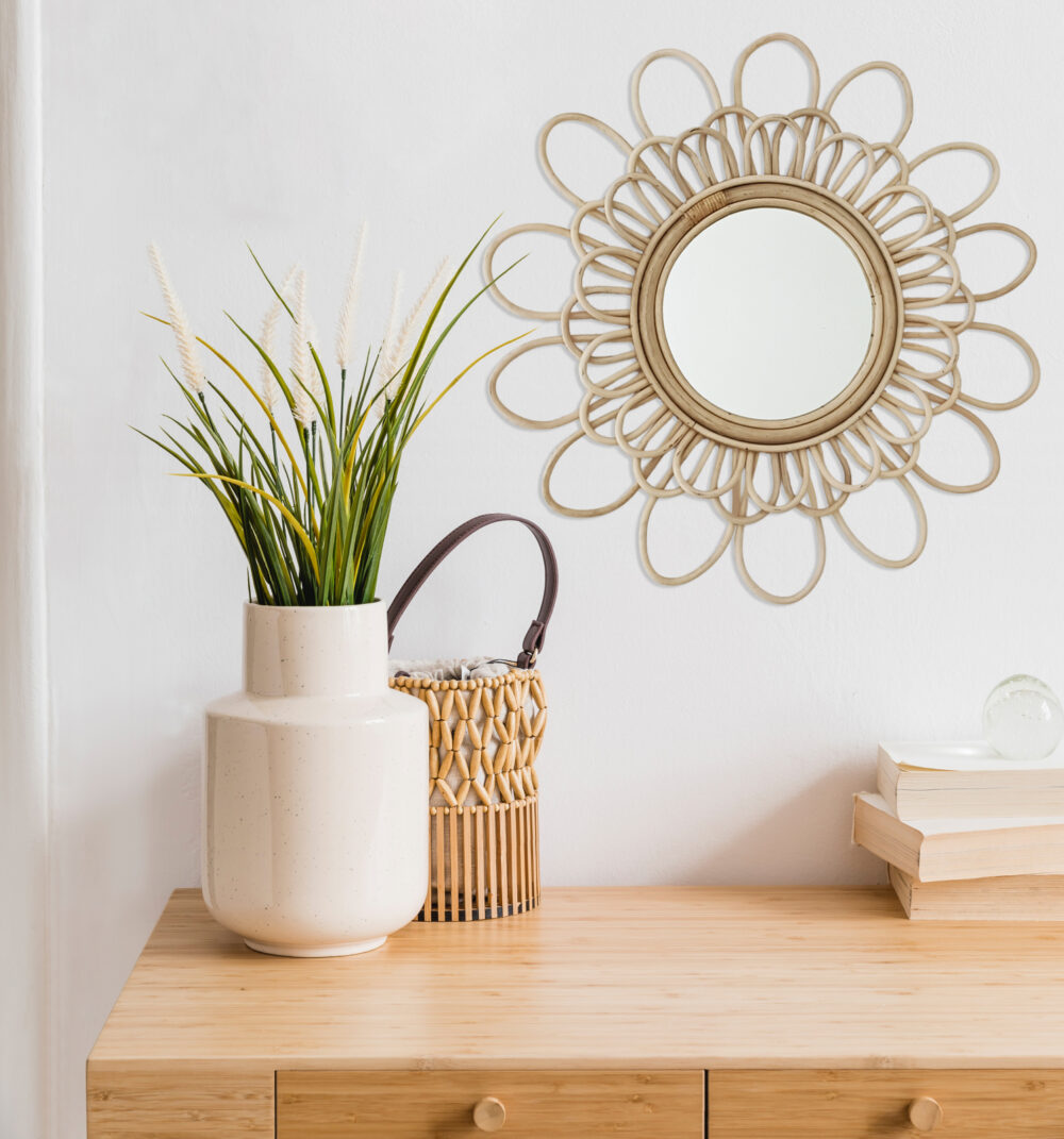 Otro espacio de la casa que se presta de maravilla para exhibir accesorios en bambú, mimbre, ratán, o más… son las paredes. Incorpora en ellas Espejos, estos objetos tan decorativos y prácticos por generar cierta sensación de amplitud en estos materiales, son capaces de añadir un toque de simpatía a cualquier estancia.