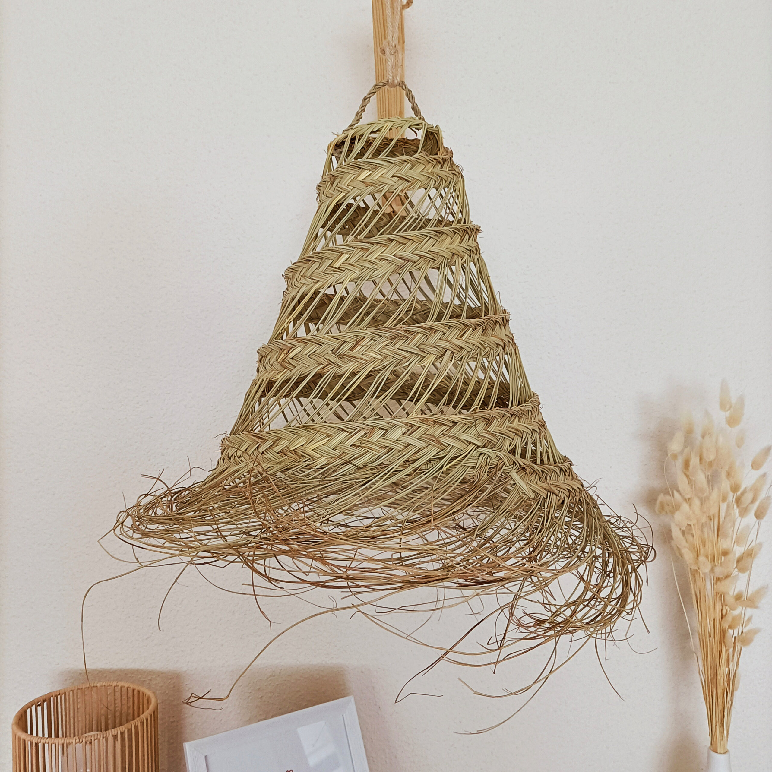 ⦁ Fabricación artesanal con hojas de esparto natural trenzada. Acabados con flecos. Forma cónica