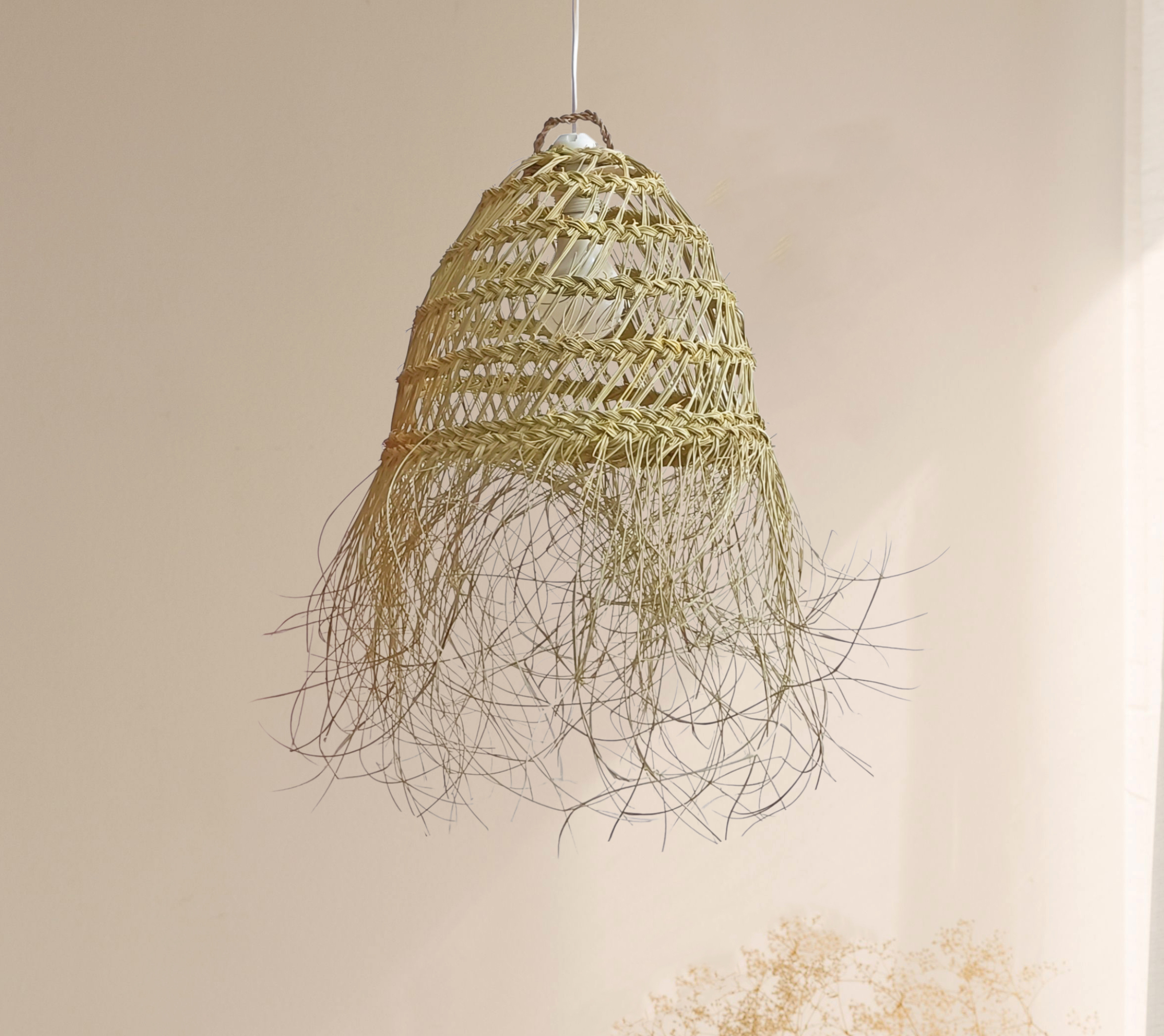 ⦁ Fabricación artesanal con hojas de esparto natural trenzada. Acabados con flecos. Forma cónica