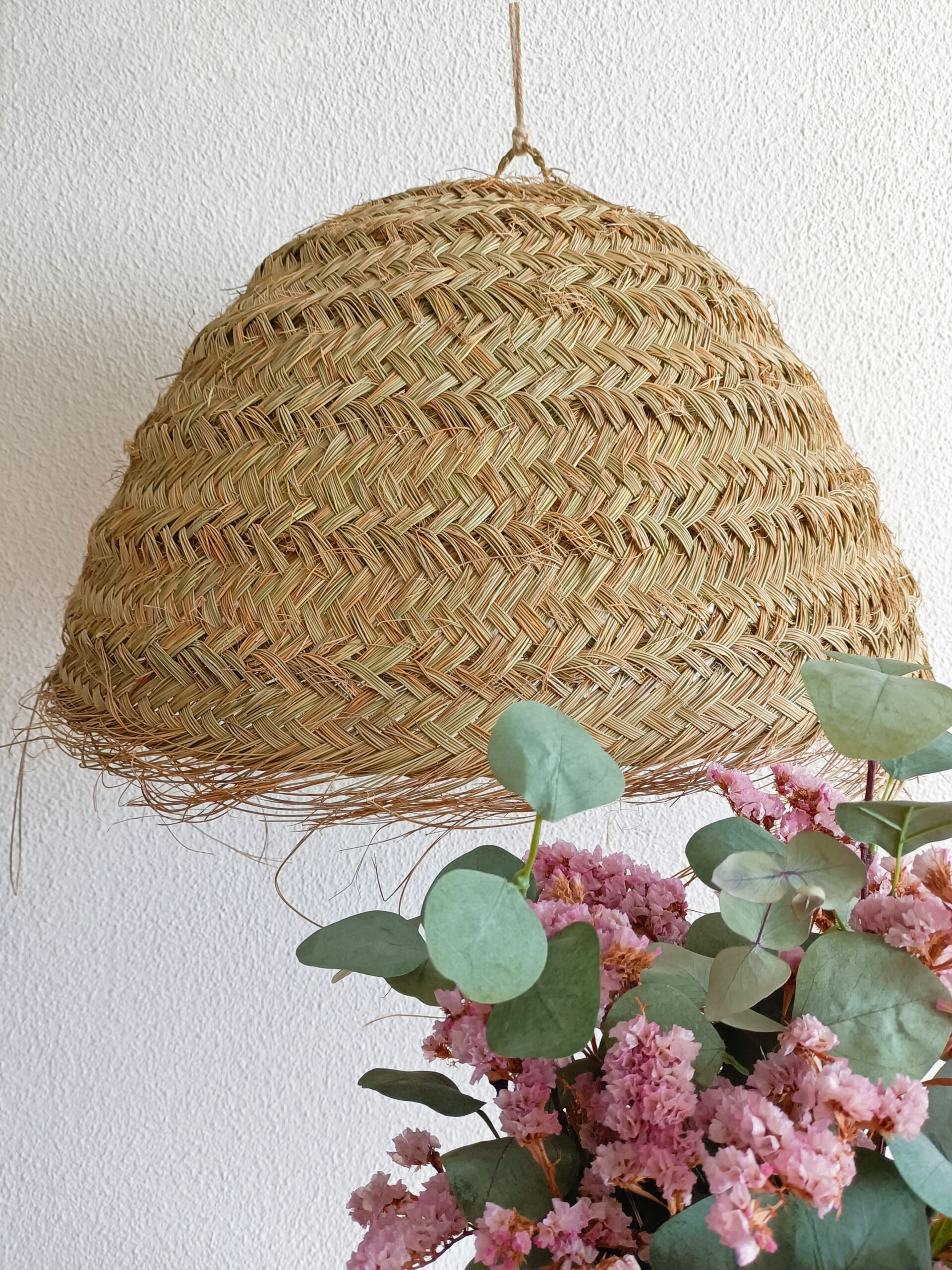 ⦁ Fabricación artesanal con esparto natural trenzada. Acabados con flecos. Forma circular