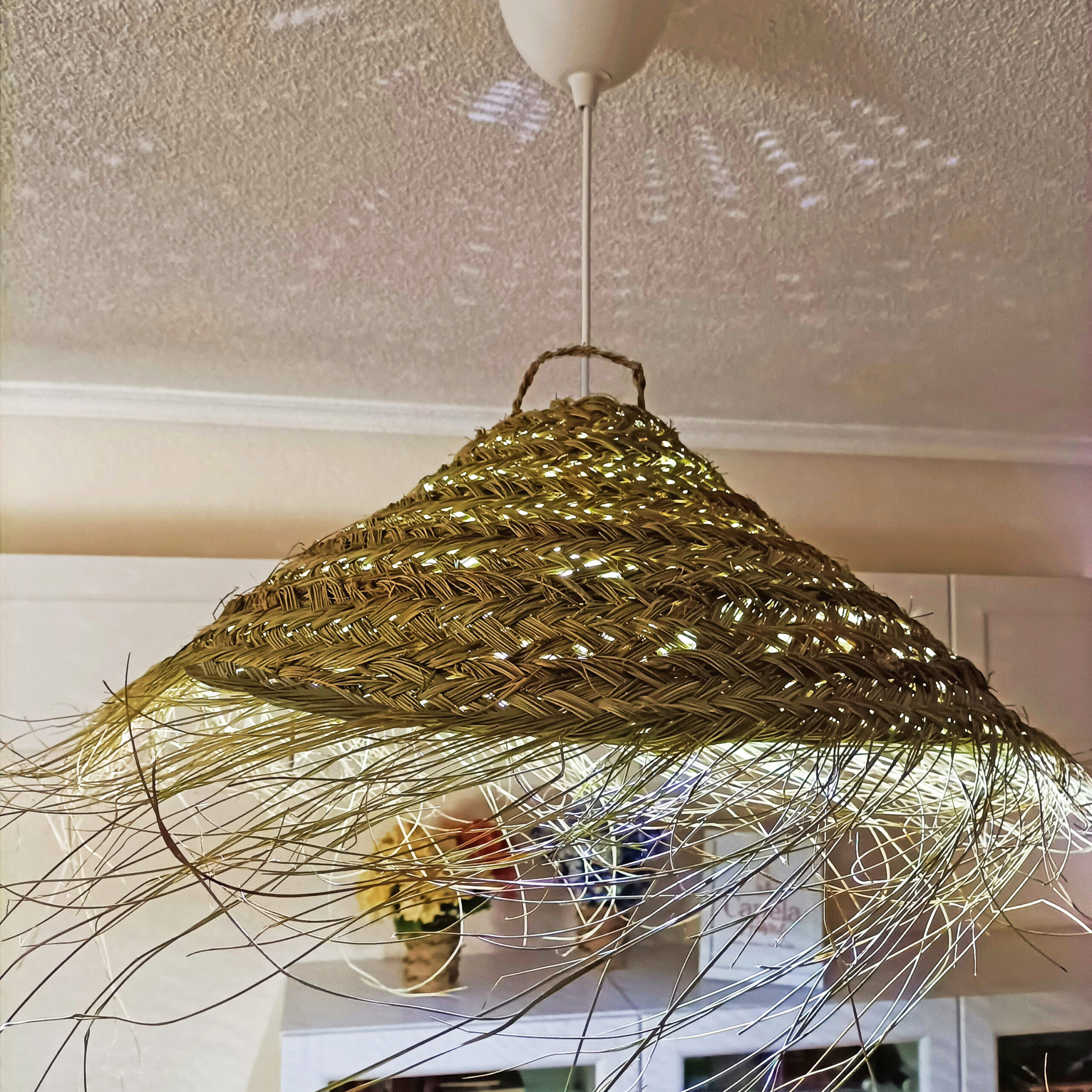 ⦁ Fabricación artesanal con hojas de palma natural trenzada. Acabados con flecos. Forma circular