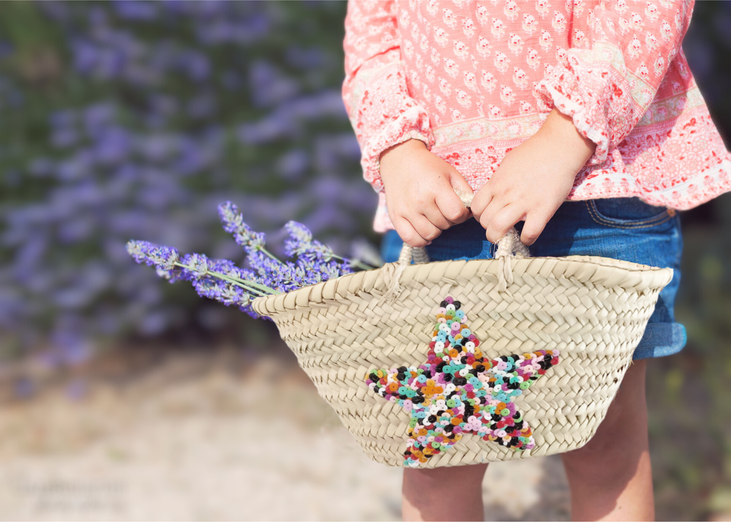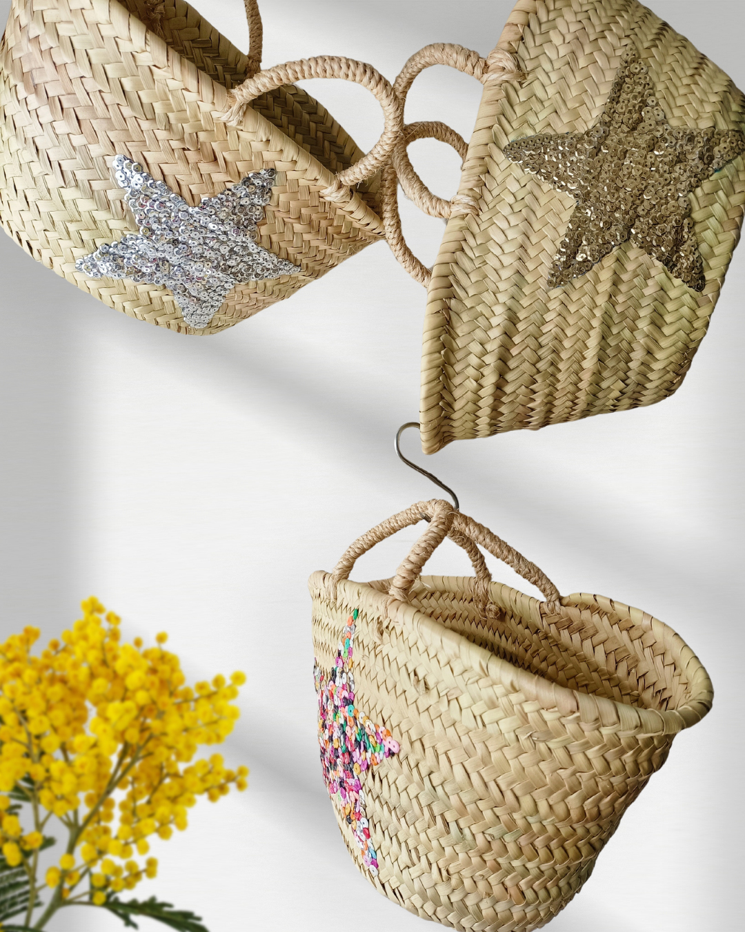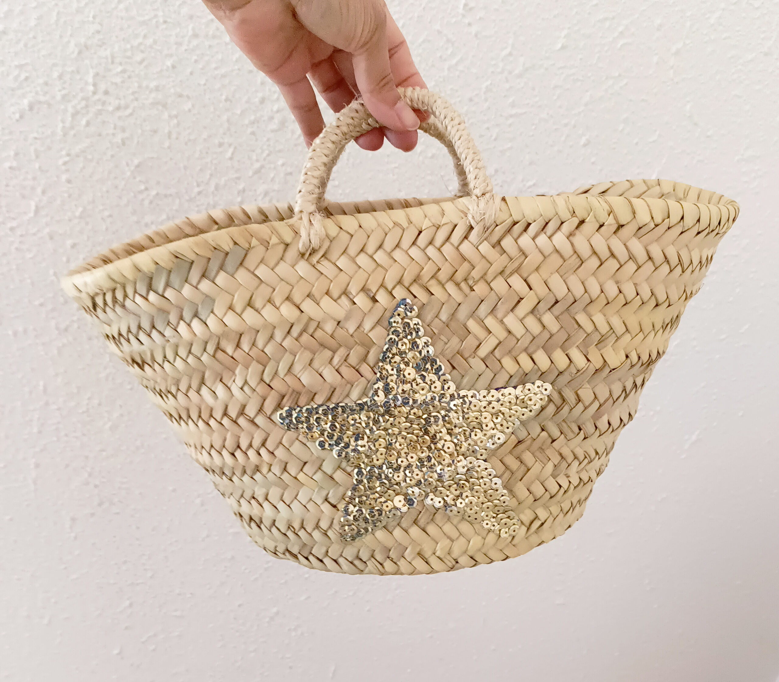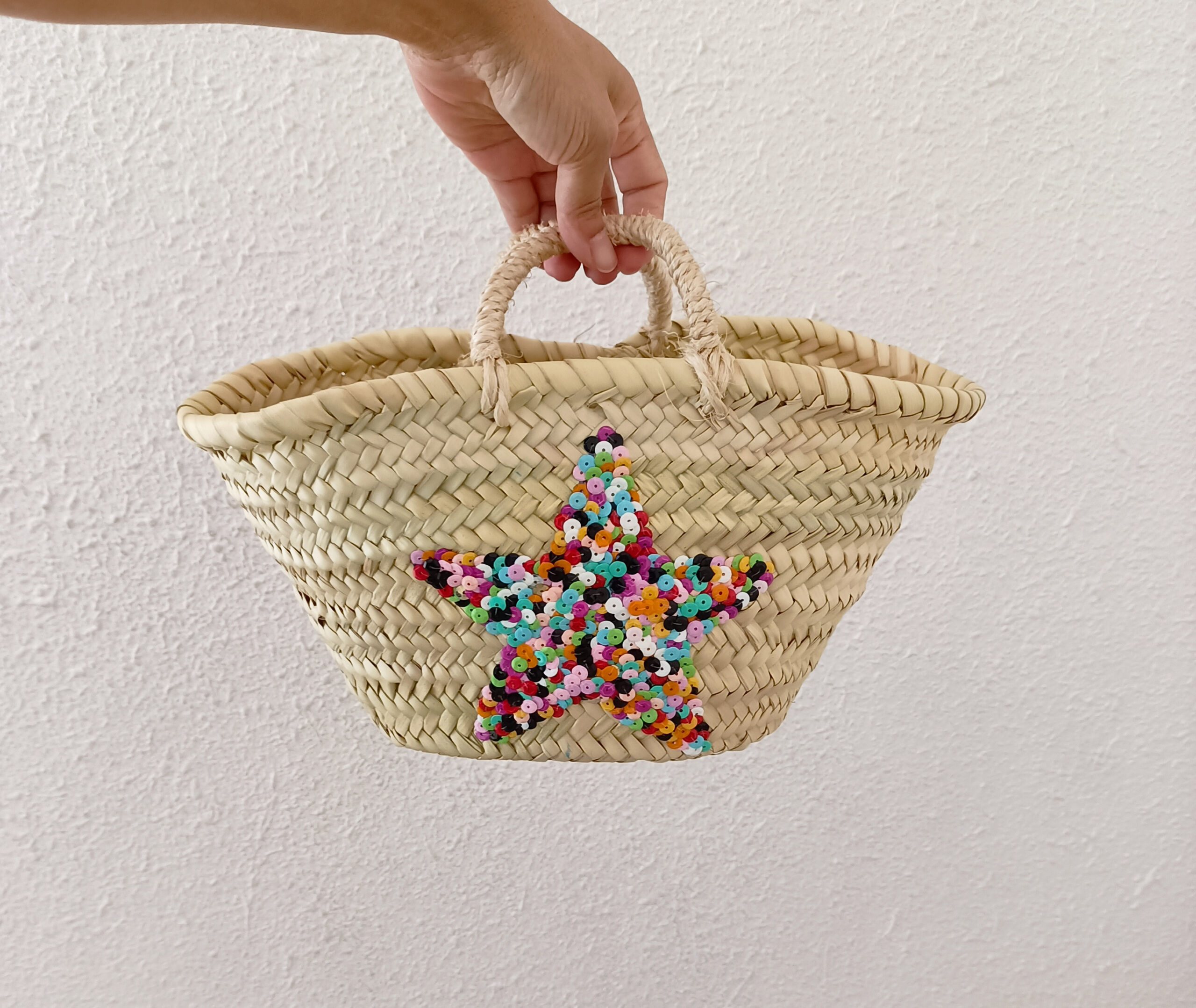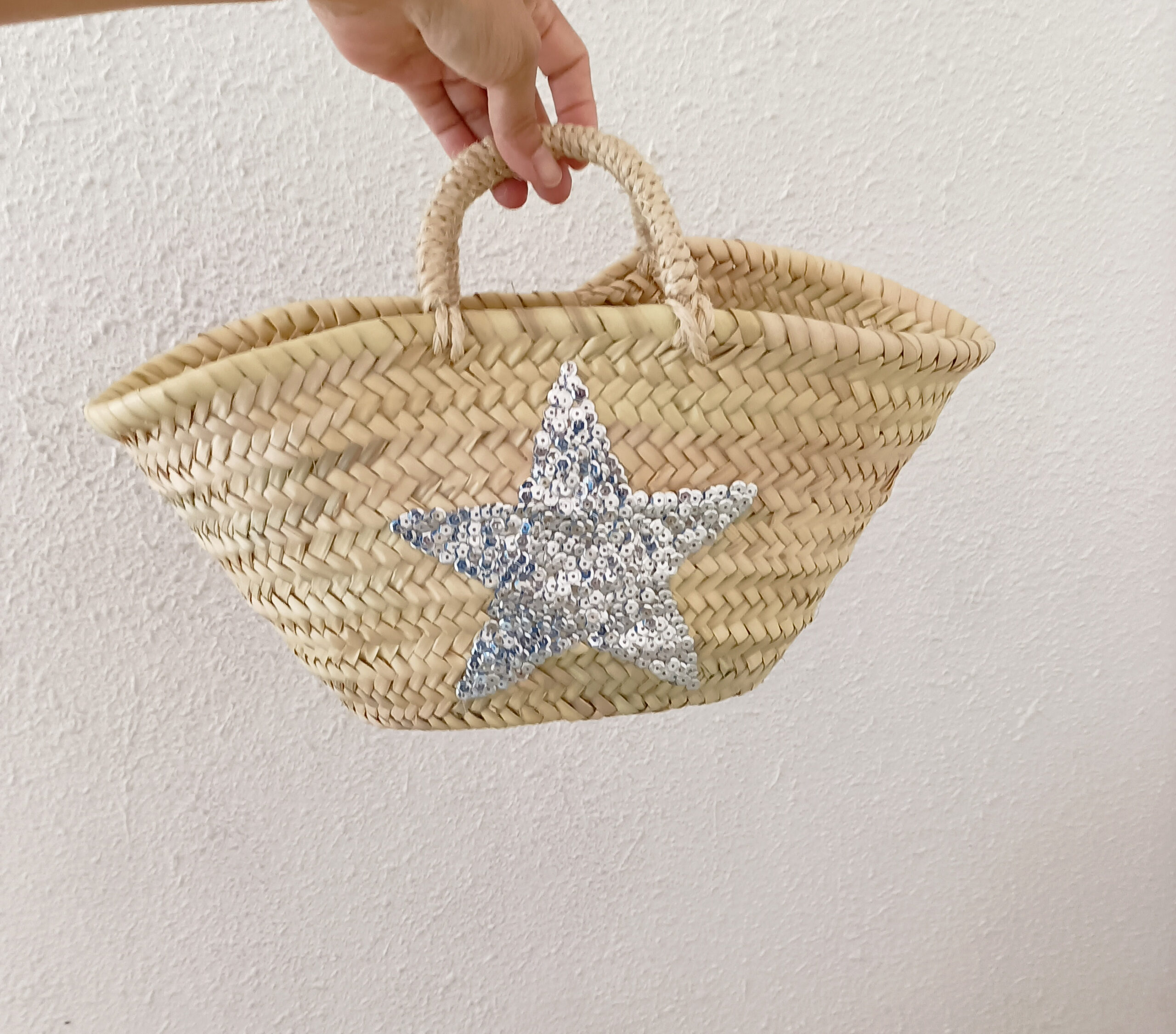 • Capazo de palma natural y asa corta, su exterior es decorado con una estrella en lentejuelas