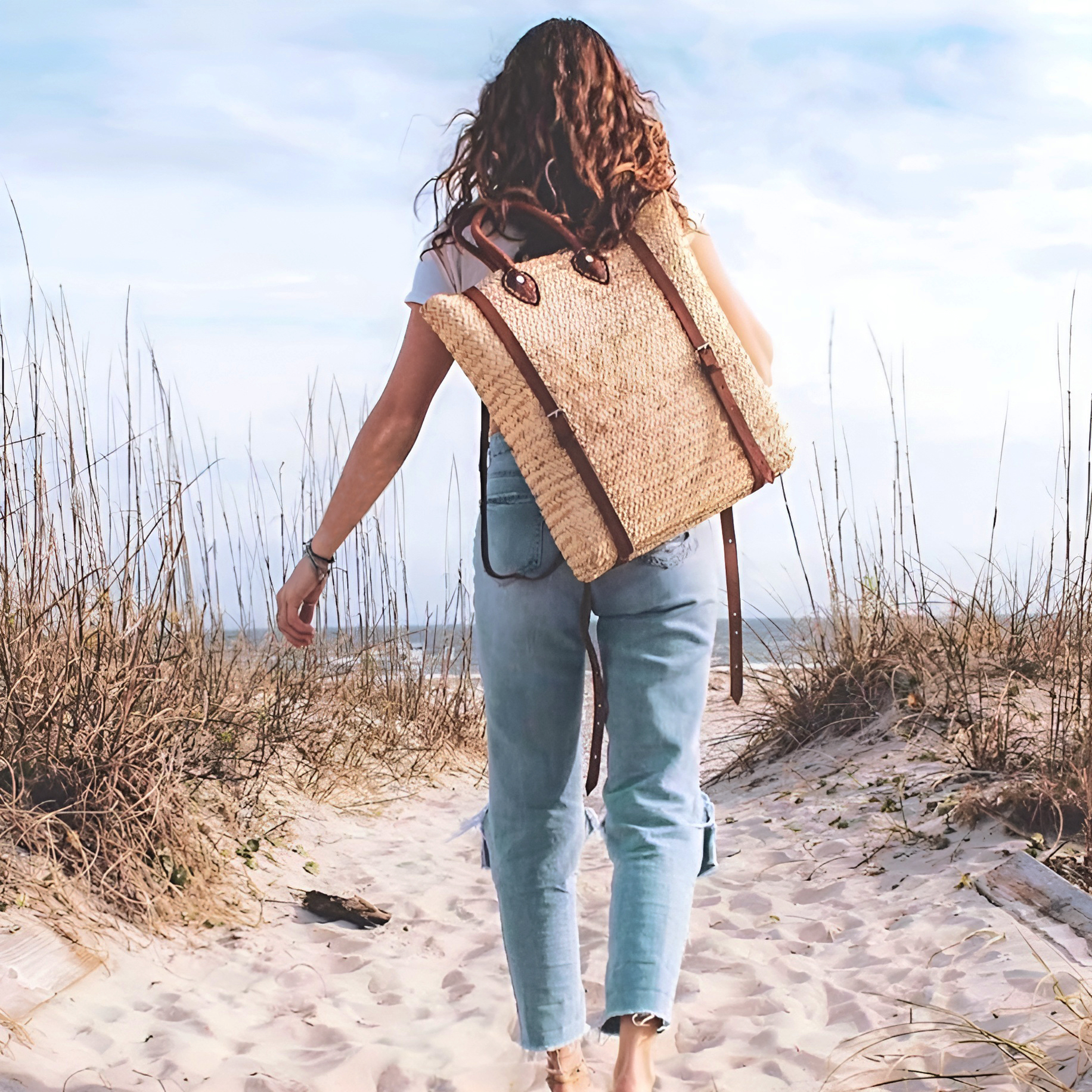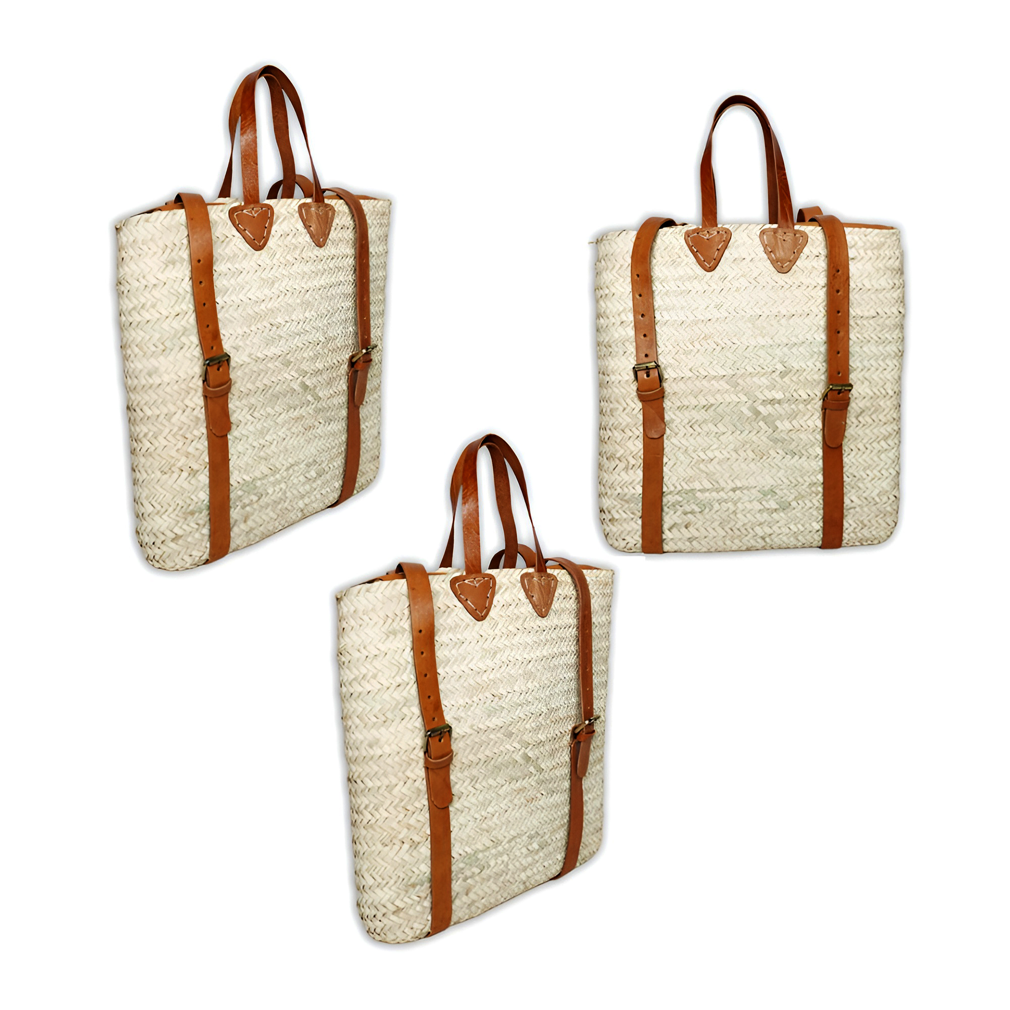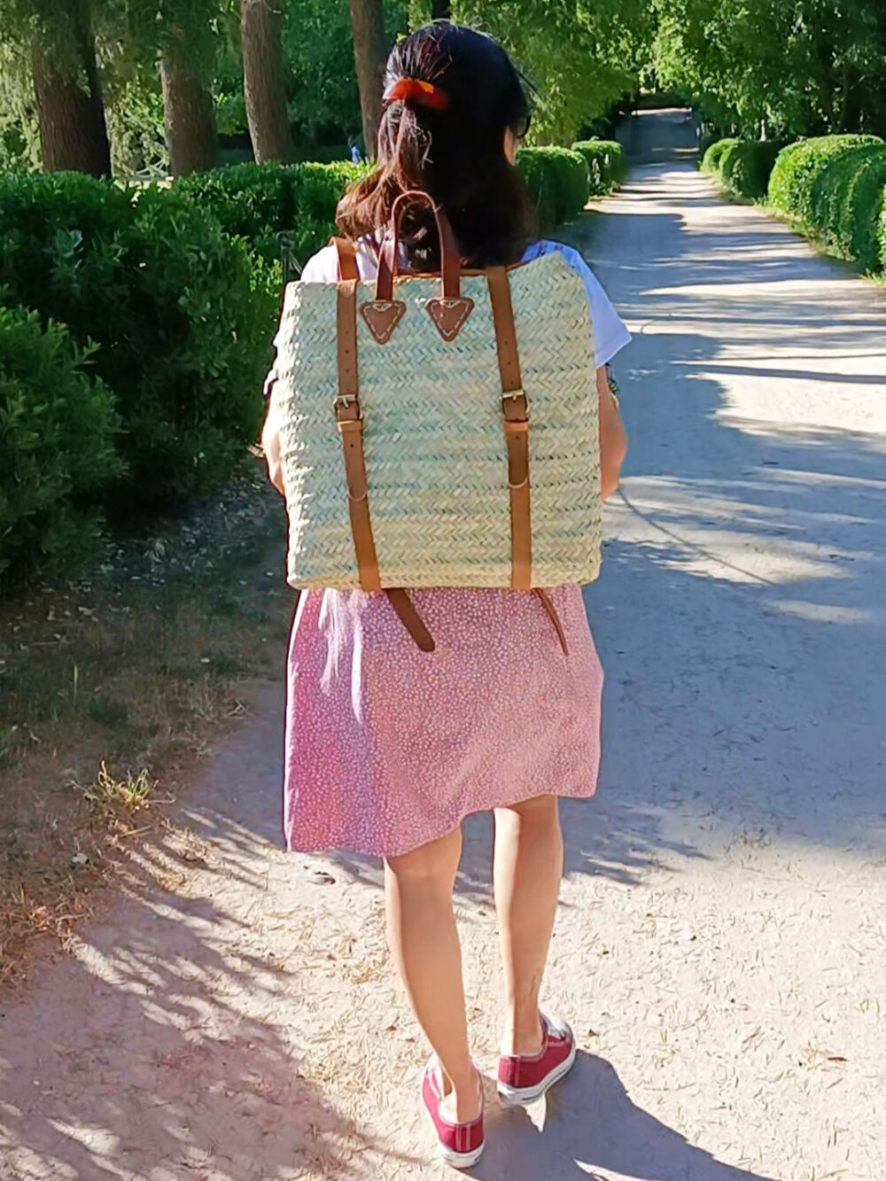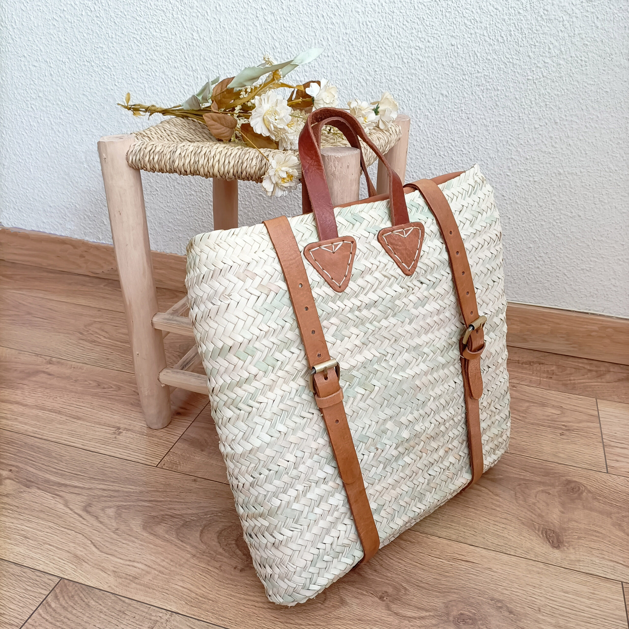 • Mochila artesanal, tejida a mano en Marruecos con hojas secas de palma.